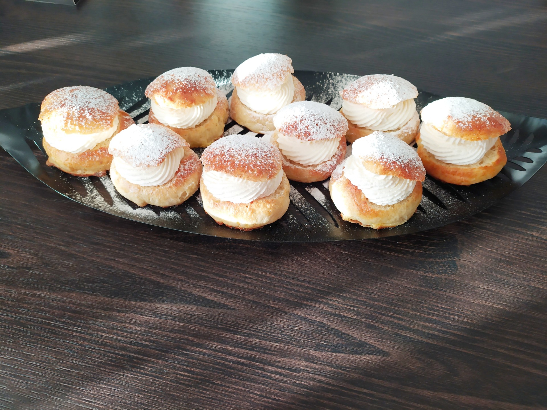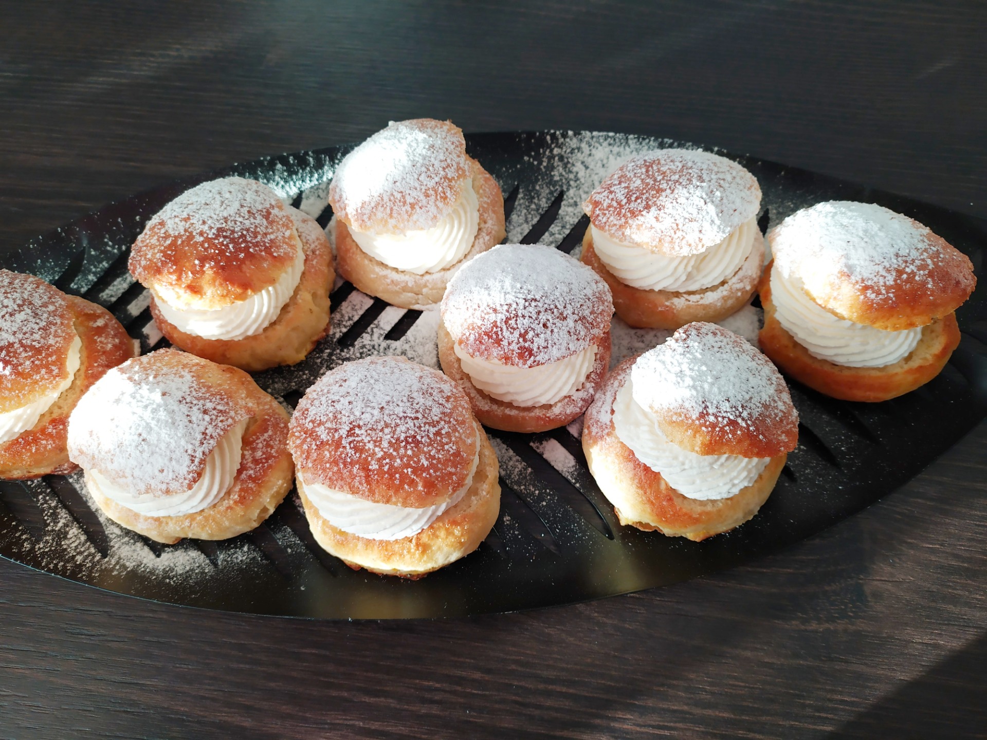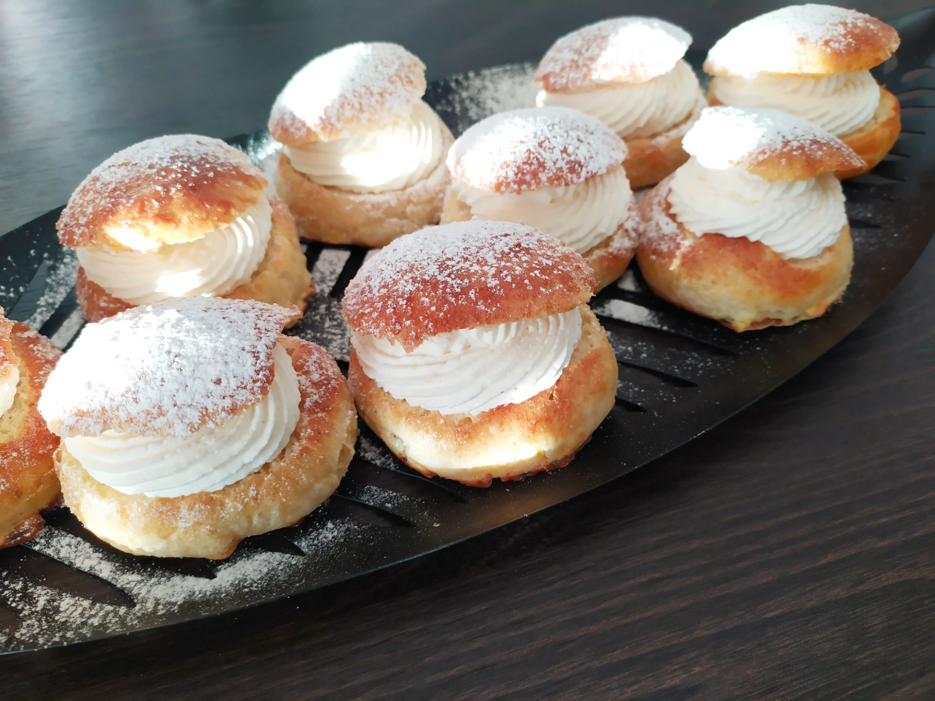 - Z bulek seřízněte ostrým nožem vršek, spodní část trošku vydlabejte a vyplňte ji mandlovou směsí. Šlehačku dejte do cukrářského sáčku s ozdobnou špičkou a naplňte každou semlu vysokou čepicí. Zlehka přiklopte odříznutou částí a pocukrujte.